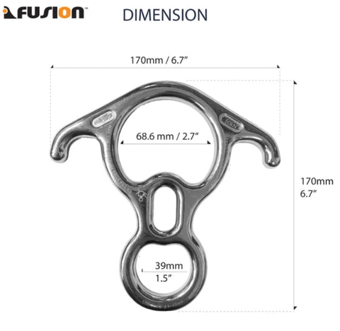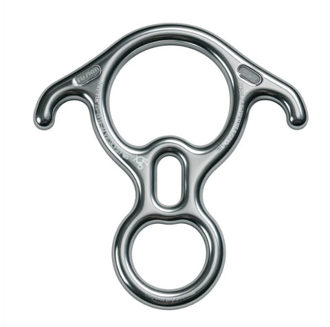 The Fusion Kura Steel Rescue 8 Descender has a large inside diameter and is equipped with ears and belay slots. The large figure eight design makes it ideal for quick use in adverse conditions and makes it easier to manage heavy loads. The ears allow the user the ability to tie off the rope and use both hands freely.